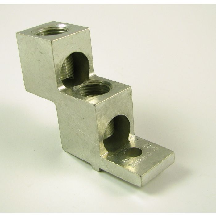 "300TP-2" 6 -300 kcmil AWG wire range, 2 barrel, Stacker type, Turn Prevent Rib, aluminum or copper wire, CU9AL, 90C temperature rating, one mounting hole for 1/4" bolt. NEMA mounting holes and spacing; this is not a NEMA tested part.