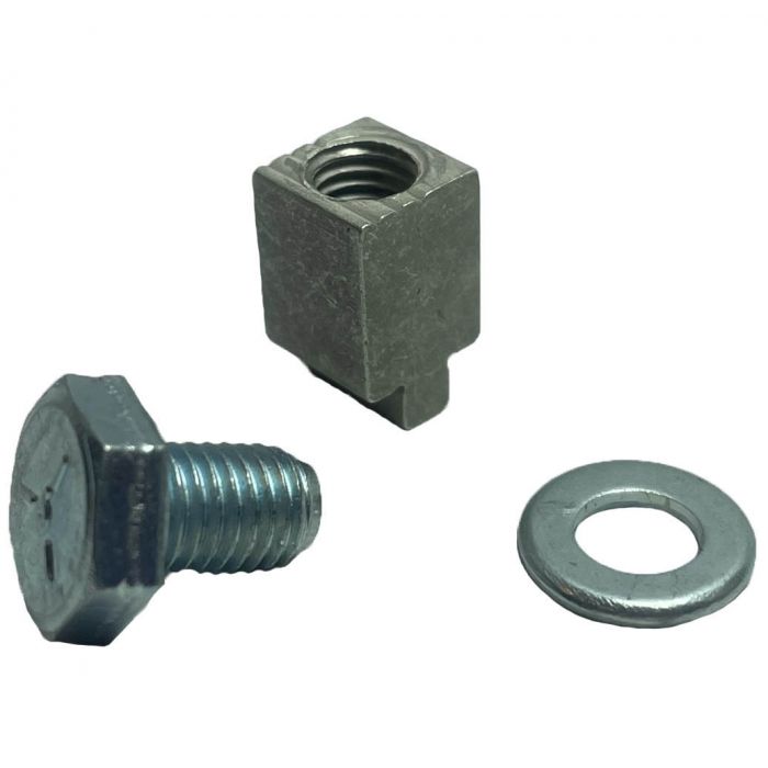 Ring lug mount block with integrated aluminum foot, tin plated, solderable. 1 leg at .336X.14” with a .13" (3.30mm) PCB penetration. Suggested ring lug wire sizes 6-14 AWG, up to 65 AMP. Kitted with a zinc plated steel 1/4-28 hex cap bolt and M6 washer.